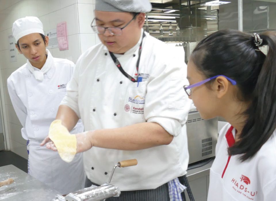 Some Heads Up students had a hands-on experience on pasta making, from scratch, with one of Malaysia’s best chef, Chef Zauhudi, Head Chef of School of Hospitality at Inti College. With just a couple of eggs, a bag of flour, a tablespoon of olive oil and a pinch of salt, these simple ingredients turned into a big lump of pasta dough, which after resting for thirty minutes, was ready to be used.